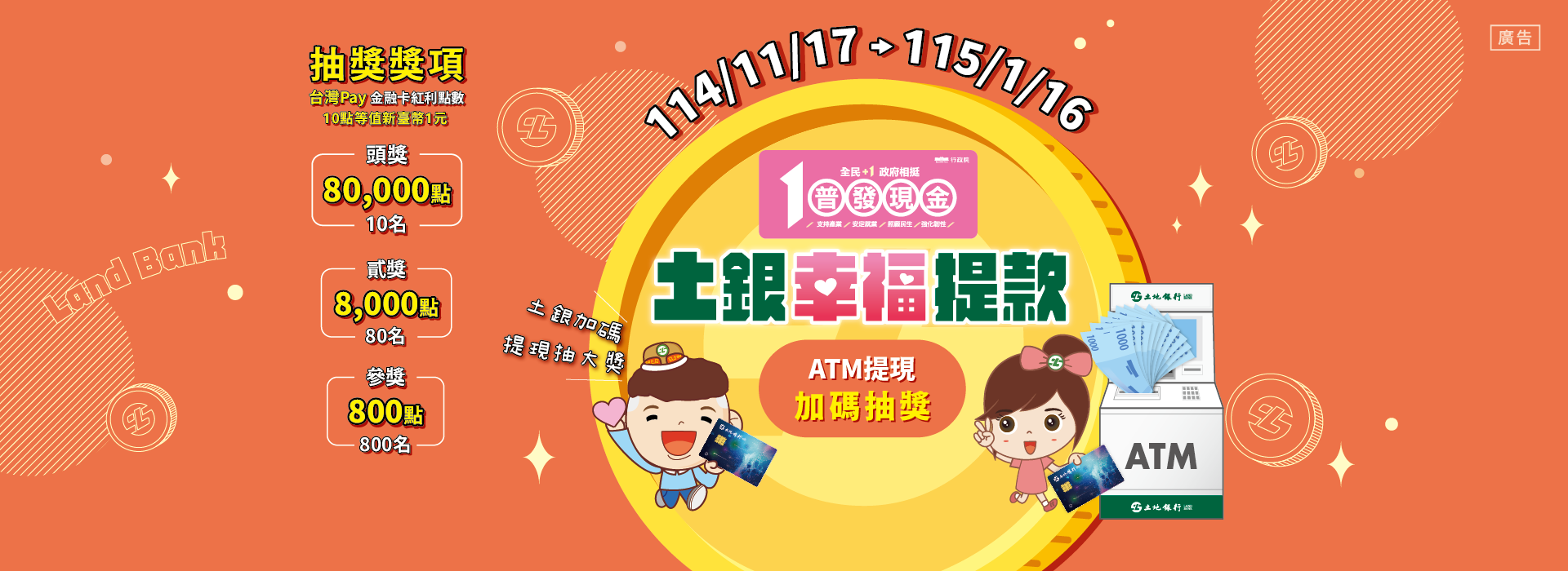 業務公告 新聞稿 本行TWQR(台灣Pay)發卡、收單、跨國購物及晶片金融卡消費扣款及跨國提款(港/澳)業務於114年11月14日(星期五)凌晨4:30~5:00間,將暫停服務約10分鐘。 【土銀信用卡×東南旅遊】日本九州指定團體旅遊現折1仟元,刷卡滿額加碼贈20吋行李箱 【土銀JCB信用卡】114年JCB信用卡卡友專屬刷卡優惠 本行企業網路銀行(含企業委託付款)114/10/30(四)12:00至12:30期間維護服務暫停公告 【台灣Pay】(延長活動期間)「土銀Pay一下 500點數送給您」活動(114/8/15-114/12/31) 了解更多 > 新聞稿 土銀員工健行 深化行員永續與反詐意識 2025/11/03 土銀參與財富管理評鑑 勇奪「最佳普惠金融獎」第一名 2025/10/30 土地銀行主辦和大工業50億元聯貸案 超額認購220% 2025/10/30 普發現金選土銀ATM 加碼再抽頭獎8,000元 2025/10/30 土銀積極營造健康職場 首度獲頒運動企業認證 2025/10/27 土地銀行舉辦淨零轉型說明會 分享法規與趨勢 2025/10/22 了解更多 >