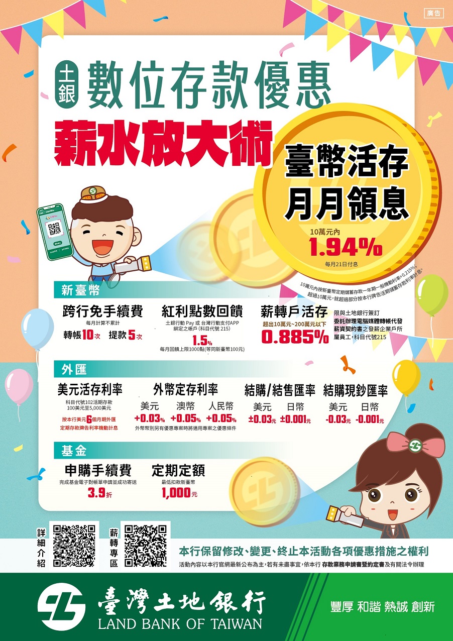 - 以「土銀行動 Pay」或「台灣行動支付 APP」(綁定臺灣土地銀行之數位存款帳戶(科目代號 215),且以金融卡掃碼消費扣款,回饋實際支付金額 1.5%之等值紅利點數(每月回饋上限為 1,000 點)。